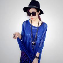 TIME XX原创 欧美宽松蝙蝠袖纯色透视中袖防晒衣中长款罩衫T恤女