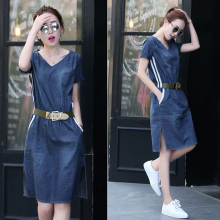 2017春夏牛仔短袖腰带V领中长款修身侧开叉女牛仔连衣裙女收腰潮
