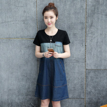 牛仔拼接连衣裙女2016夏新款韩范女装修身T恤裙时尚百搭短袖中裙