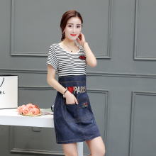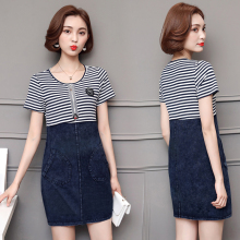 2017夏季新款韩版百搭条纹拼接牛仔连衣裙潮女装加大码修身牛仔裙