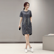 连衣裙女夏2017新款大码直筒裙短袖修身中长薄款牛仔连衣裙休闲潮