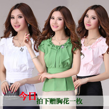 女夏季新品 雪纺缎纹邹面料短袖荷叶边圆领收腰白色上衣修身工装