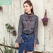 2017新品喇叭袖蝴蝶结衬衫女长袖雪纺韩范印花清新甜美休闲衬衣夏