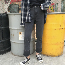 牛仔裤女高腰2017春季新款港风直筒裤毛边阔腿显瘦哈伦宽松九分裤