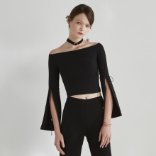 欧美春装新款一字领开叉水袖蝴蝶结系带修身短款T恤优雅上衣8146