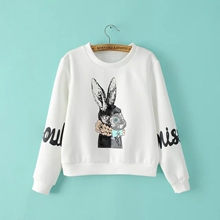 秋冬新款韩版休闲卡通兔子印花加绒学生上衣太空棉宽松套头卫衣女