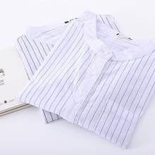 秋季宽松百搭文艺小清新衬衫女长袖纯棉竖条纹圆领简约打底衬衣女