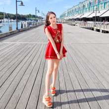 T-Baby欧美风 夏装新款女装 红色雪纺网纱无袖连衣裙绣花金线刺绣