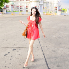 T-Baby欧美风 夏装新款女装 红色雪纺连衣裙无袖背心裙木耳边仙女