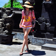 T-Baby欧美大牌民族风印花雪纺衫上衣中长款修身2017夏装新款女装