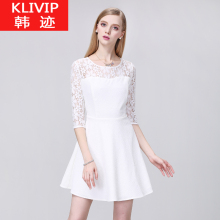 韩迹2016春装新款蕾丝a字裙子 中长款七分袖显瘦白色连衣裙女气质