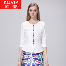 韩迹 2017春秋新款修身短款蕾丝镂空七分袖小西装薄款短外套女夏