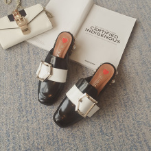 2017春新款女鞋单鞋一字扣带包头凉拖鞋白色复古风方头一脚蹬潮鞋