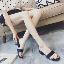 欧美2016季新款方头粗跟中跟凉拖百搭个性一字拖鞋女夏时尚 外穿