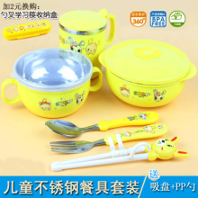 儿童餐具卡通不锈钢碗套装宝宝双耳辅食碗勺防摔带盖训练学习筷子