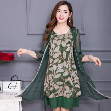 夏季连衣裙两件套女装2017春夏新品中长款修身印花雪纺连衣裙