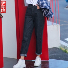 新款韩国高腰九分bf膝盖破洞牛仔裤女显瘦宽松哈伦裤阔腿休闲裤女