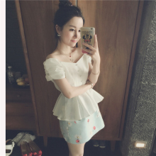 TUTUFEEL 2017夏装新款 蕾丝拼接蓝色显瘦泡泡短袖衬衫上衣 女