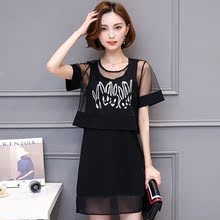 女装夏装2017新款潮大码胖mm假两件连衣裙夏季性感雪纺胖妹妹短袖