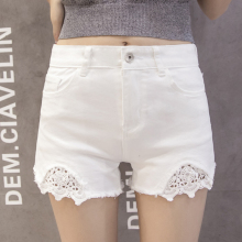 高腰白色短裤女夏韩版学生个性蕾丝拼接弹力显瘦休闲纯棉毛边热裤
