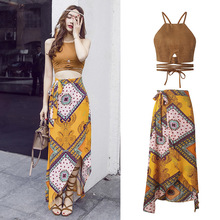 17新款春夏女两件套吊带抹胸短紧身露腰上衣+花色半身长裙沙滩裙