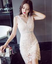 2017春夏新款无袖V领收腰A字连衣裙性感钩花镂空修身短裙蕾丝女装