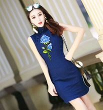 2017春夏新款复古旗袍女装无袖立领刺绣花朵修身包臀牛仔连衣裙蓝