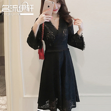 黑色蕾丝连衣裙女中长款2017春夏装新款韩版显瘦镂空V领a字裙