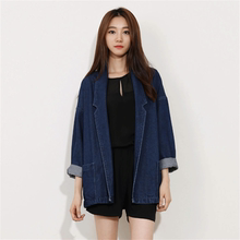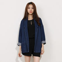 2015春秋新款原宿BF风深色 大码中长款宽松牛仔外套西装领牛仔外