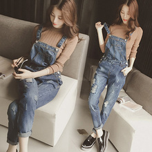 2016春夏季学院风破洞牛仔背带裤女九分裤宽松韩国新款学生小脚裤