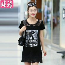 嬉琦夏装t恤女短袖韩版印花钉珠蕾丝拼接中长款休闲宽松白色体恤