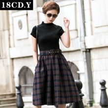 18cdy2016秋装新品女 欧洲站复古格子拼接大摆针织毛衣短袖连衣裙