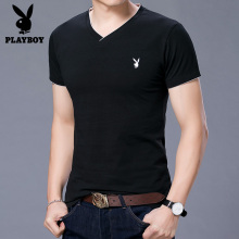 花花公子短袖T恤 男士夏季薄款V领纯黑色打底衫半袖修身潮流男装