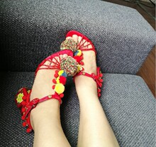 走秀印刷麻将跟毛球金属镶嵌缝钻T型带凉鞋