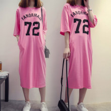 夏季女士韩版纯棉休闲长裙大码宽松中袖女装连衣裙子印花打底裙装