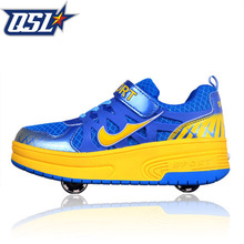 QSL儿童网面透气双轮暴走鞋自动隐形按钮男女带滑轮的运动鞋夏季