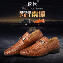 男士鞋子潮鞋春秋季透气英伦风手工编织休闲皮鞋高档真皮懒人男鞋