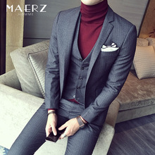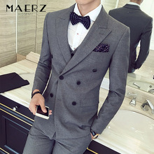 MAERZ春季纯色西服套装男士双排扣西装三件套韩版修身青年西装套