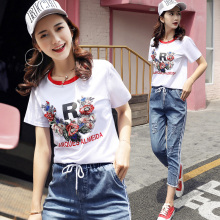 2017韩国夏季新款韩版刺绣爱心V领短袖套头T恤女竹节棉学生百搭潮