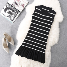 春秋新款韩版百搭荷叶边无袖连衣裙修身鱼尾针织背心裙条纹打底裙