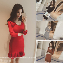 2016秋冬女打底衫长袖连衣裙修身显瘦V领中长款针织打底裙女秋衣