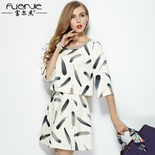 富尔杰2017春装新款 韩版时尚女装两件套装气质中袖印花连衣裙