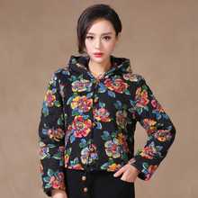 2016冬季连帽印花时尚修身小花袄 棉麻复古民族风短款棉衣外套女