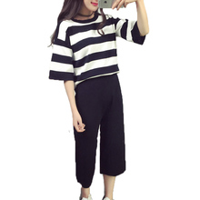 2017春夏新款休闲套装女韩版条纹学生哈伦阔腿裤两件套时尚运动服