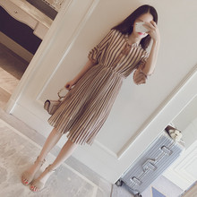 2017夏季新款韩版显瘦竖条纹短袖雪纺连衣裙女中长款喇叭袖裙子