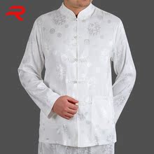 春秋中老年男士衬衫长袖薄款棉立领盘扣唐装衬衫套装大码爸爸装