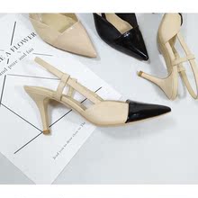 尖头凉鞋女夏2017新款拼色中跟性感裸色后空绑带包头浅口细高跟鞋