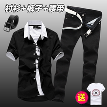 春夏季男式韩版短袖衬衫牛仔长裤子休闲一套装男装青年潮流衬衣服