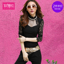 欧得拉2016新品秋季镂空打底衫韩版长袖蕾丝拼接上衣修身小衫领