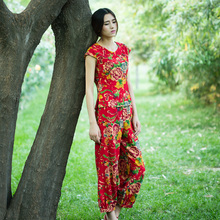 2017春夏新款民族风亚麻七分裤灯笼裤短袖上衣东北大花布棉麻套装